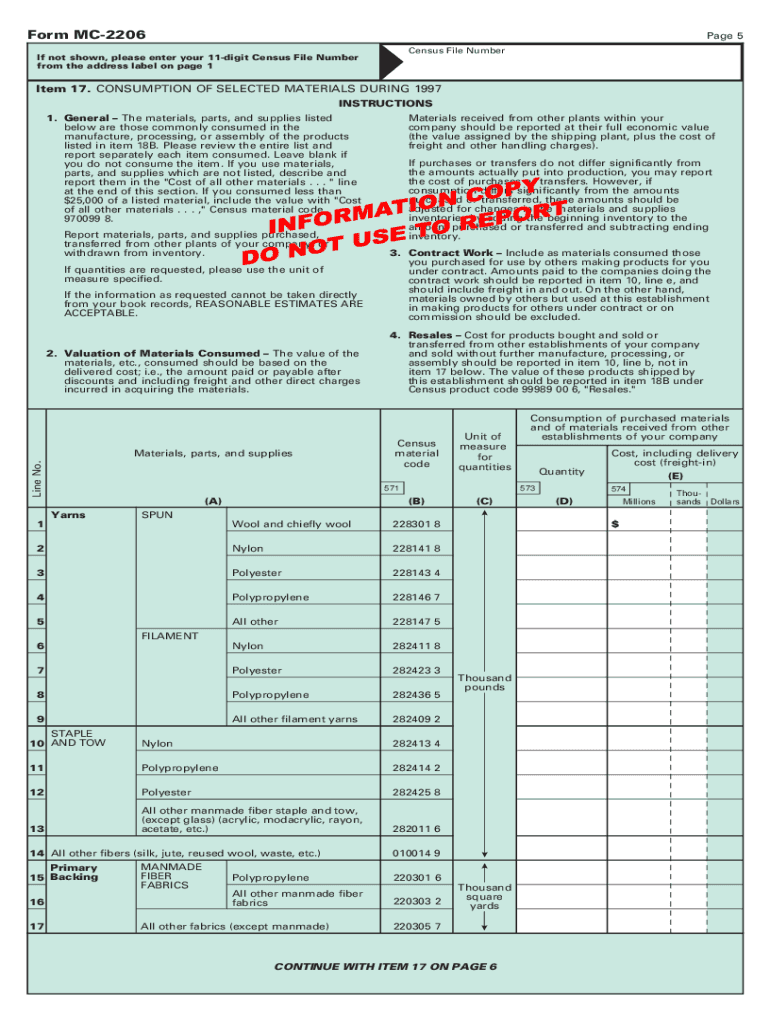 Form MC2206Page 5 Census File Number not shown, please enter your 11digit Census File Number from the address label on page 1Item 17. CONSUMPTION OF SELECTED MATERIALS DURING 1997 INSTRUCTIONS 1.