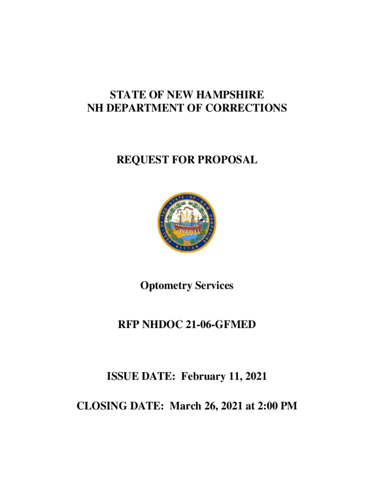STATE OF NEW HAMPSHIRE NH DEPARTMENT OF CORRECTIONSREQUEST FOR PROPOSALOptometry Services RFP NH DOC 2106GFMEDISSUE DATE: February 11, 2021, CLOSING DATE: March 26, 2021, at 2:00 Potable of Contents