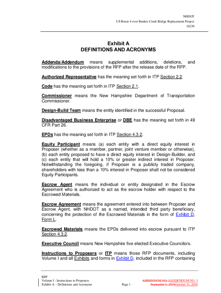 NH DOT US Route 4 over Bunker Creek Bridge Replacement Project 16236Exhibit A DEFINITIONS AND ACRONYMS Addenda/Addendum means supplemental additions, deletions, and modifications to the provisions
