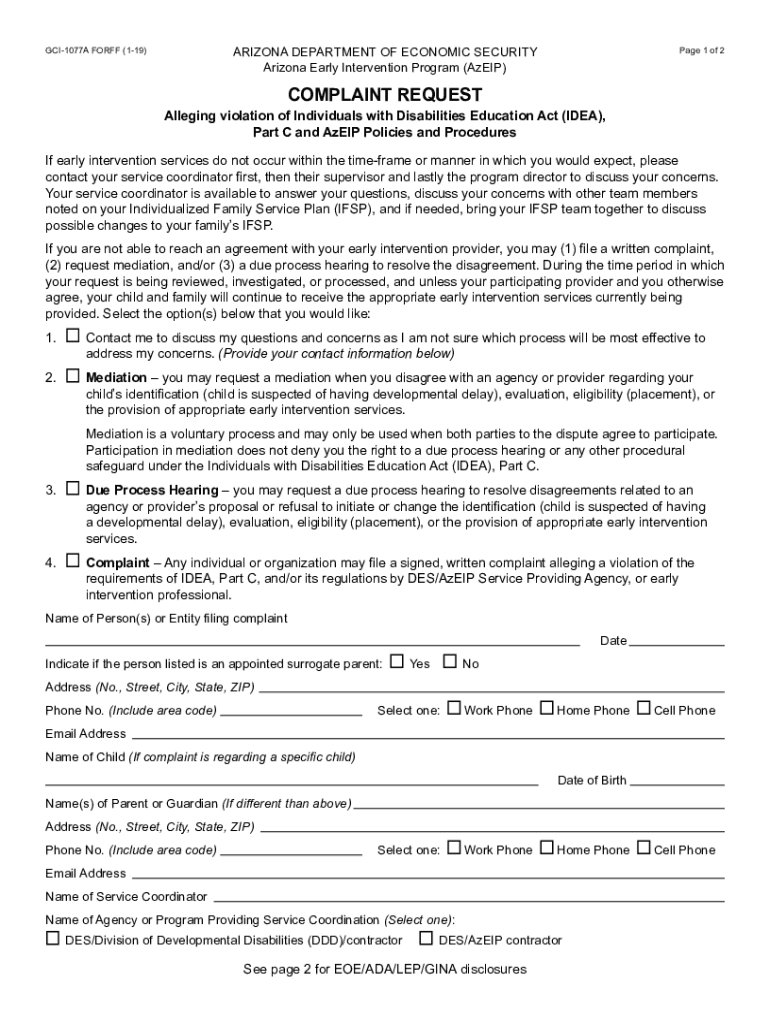 ARIZONA DEPARTMENT OF ECONOMIC SECURITY Arizona Early Intervention Program (Zip)GCI1077A FOR FF (119)Page 1 of 2COMPLAINT REQUESTAlleging violation of Individuals with Disabilities Education Act (IDEA),