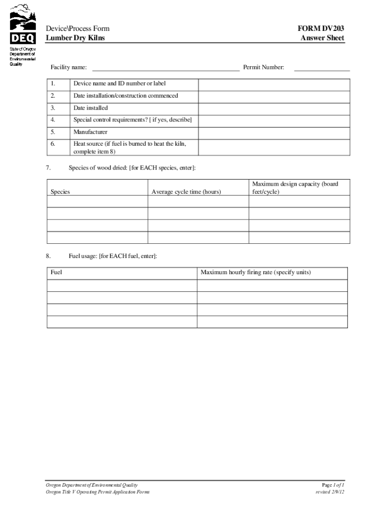 DeviceProcess Form Lumber Dry Inform DV203 Answer SheetFacility name:Permit Number:1. Device name and ID number or label2. Date installation/construction commenced3. Date installed4. Special control