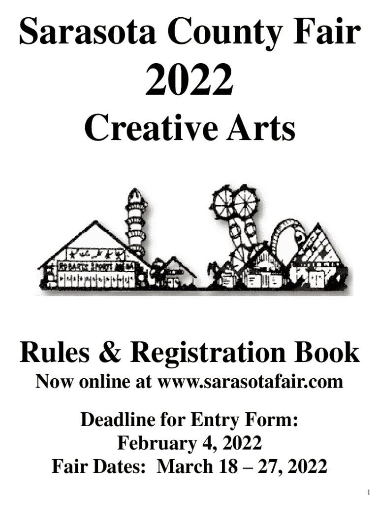 Sarasota County Fair2022 Creative Articles & Registration Book Now online at www.sarasotafair.com Deadline for Entry Form: February 4, 2022, Fair Dates: March 18 27, 2022 1Creative Arts Committee
