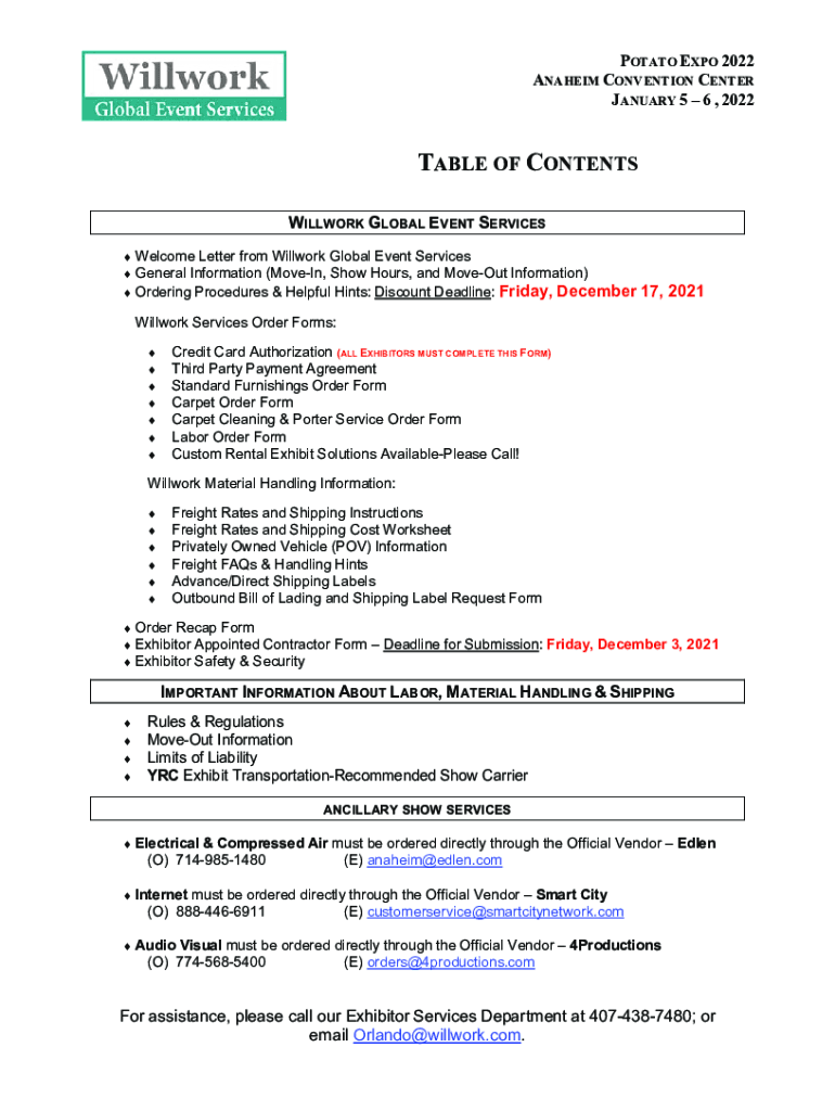 POTATO EXPO 2022 ANAHEIM CONVENTION CENTER JANUARY 5 6, 2022TABLE OF CONTENTS WILLOW GLOBAL EVENT SERVICES Welcome Letter from Will work Global Event Services General Information (Move In, Show Hours,