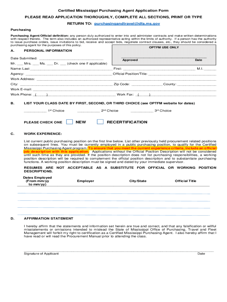 Get the free PDF Certified Mississippi Purchasing Agent Application Form