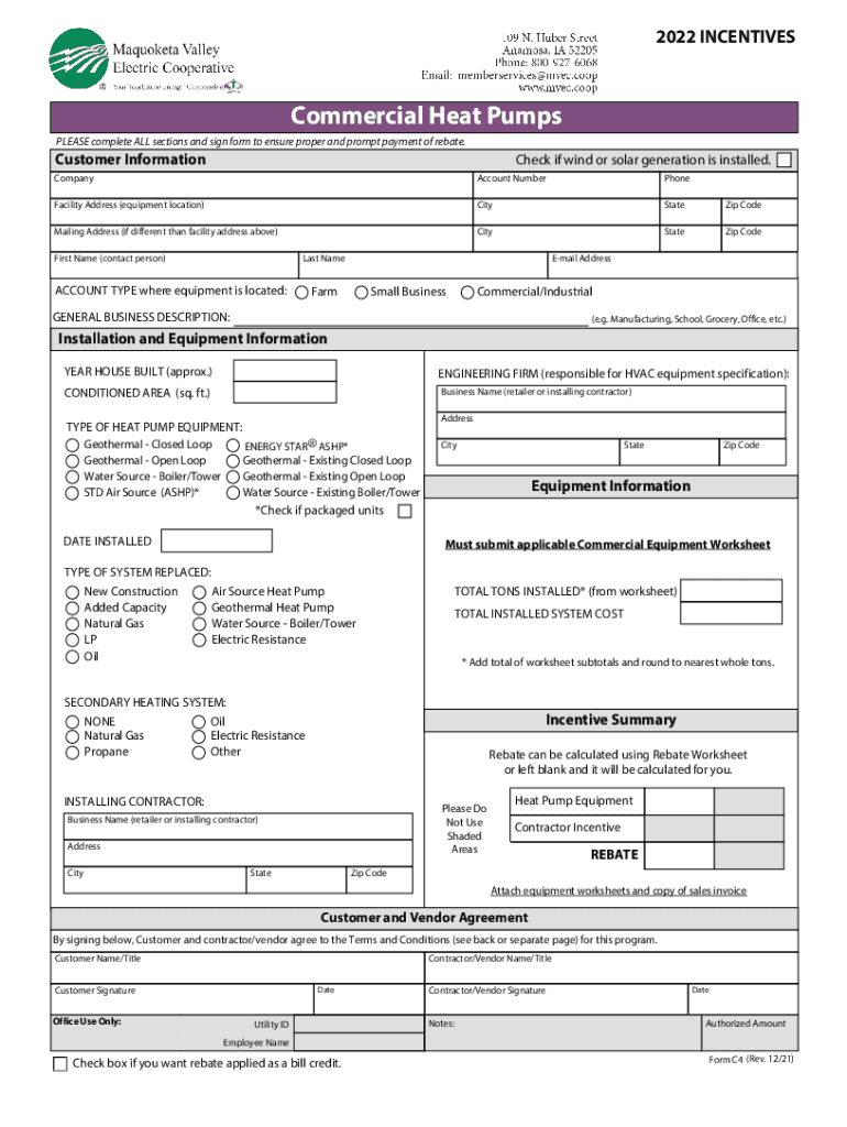 2022 INCENTIVESCommercial Heat Pumps PLEASE complete ALL sections and sign form to ensure proper and prompt payment of rebate. Customer InformationCheck if wind or solar generation is installed. CompanyAccount