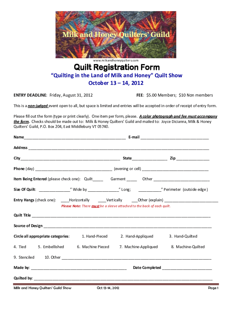 WWW.milkandhoneyquilters.communist Registration Form Quilting in the Land of Milk and Honey Quilt Show October 13 14, 2012 ENTRY DEADLINE: Friday, August 31, 2012FEE: $5.00 Members; $10 Non membership