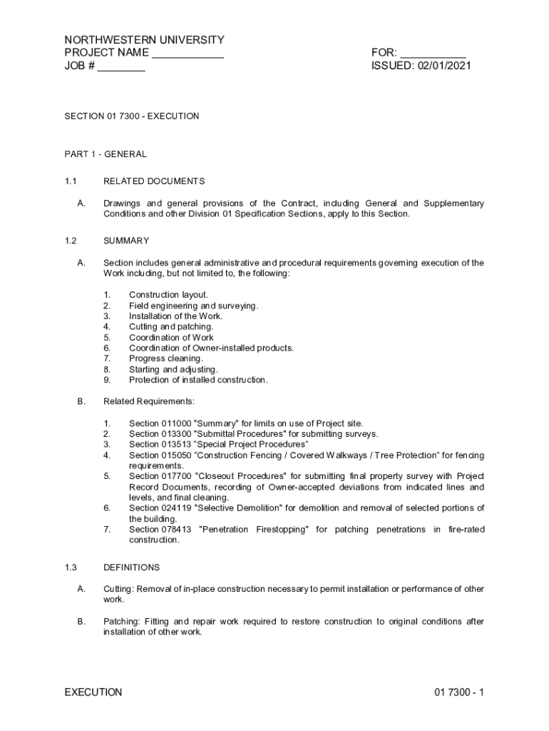 NORTHWESTERN UNIVERSITY PROJECT NAME ___ JOB # ___FOR: ___ ISSUED: 02/01/2021SECTION 01 7300 EXECUTIONGENERAL 1.1RELATED DOCUMENTS A.1.2Drawings and general provisions of the Contract, including General