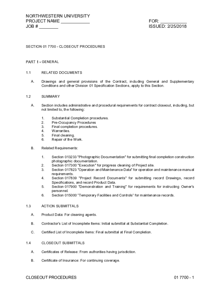 NORTHWESTERN UNIVERSITY PROJECT NAME ___ JOB # ___FOR: ___ ISSUED: 2/25/2018SECTION 01 7700 CLOSEOUT PROCEDURESGENERAL 1.1RELATED DOCUMENTS A.1.2Drawings and general provisions of the Contract, including
