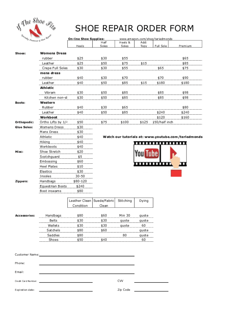 SHOE REPAIR ORDER FORM Online Shoe Supplies: Half Heels Soles Shoes:www.amazon.com/shop/teriedmonds Heels & Add: Soles Top Full SolePremiumWomens Dress rubber×25×30×55Leather×25×50×75Crepe Full