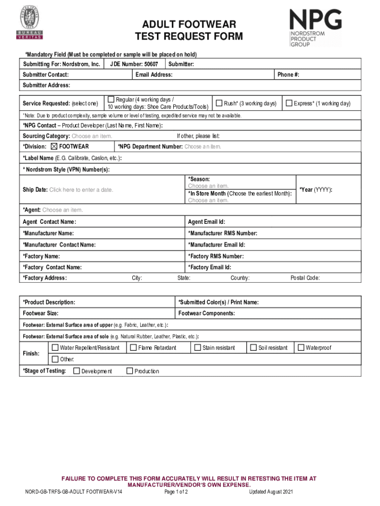 ADULT FOOTWEAR TEST REQUEST FORM *Mandatory Field (Must be completed or sample will be placed on hold) Submitting For: Nordstrom, Inc. JDE Number: 50607 Submitter: Submitter Contact:Email Address:Phone