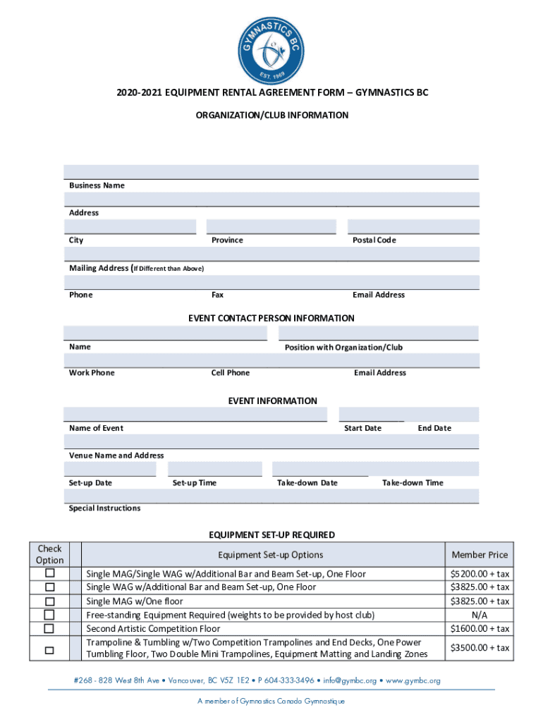20202021 EQUIPMENT RENTAL AGREEMENT FORM GYMNASTICS BC ORGANIZATION/CLUB INFORMATIONBusiness Name Address CityProvincePostal CodeFaxEmail AddressMailing Address (If Different from Above) Nonevent