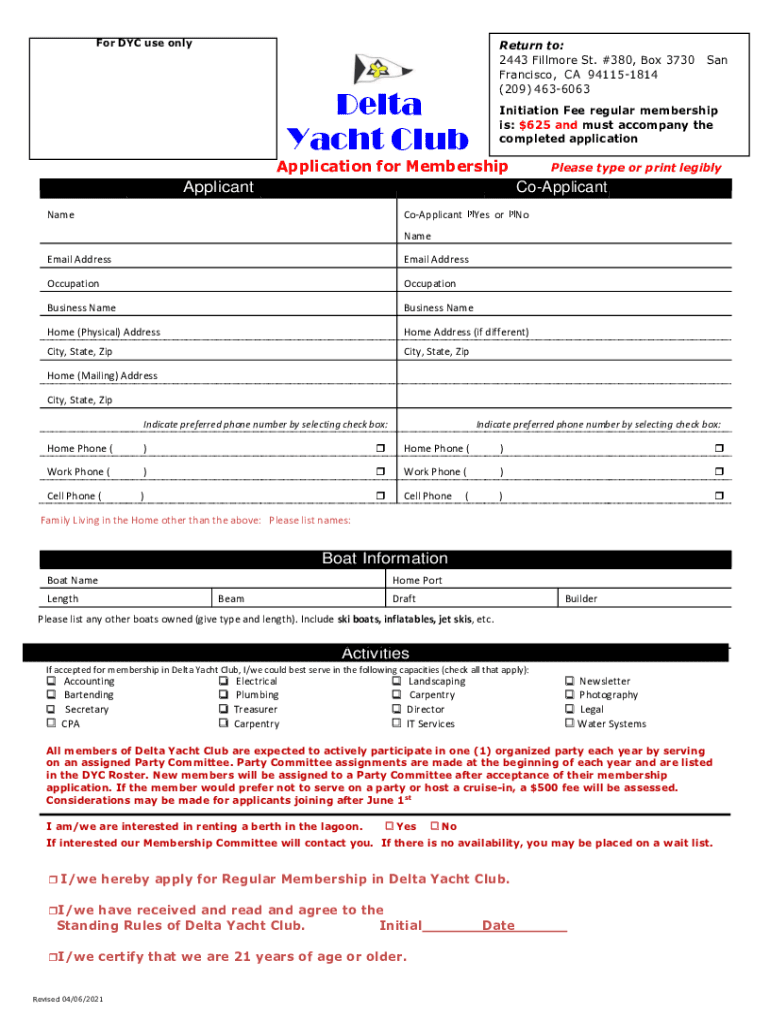For NYC use onlyReturn to: 2443 Fillmore St. ×380, Box 3730 Francisco, CA 941151814 (209) 4636063Delta Yacht ClubSanInitiation Fee regular membership is: $625 and must accompany the completed applicationApplication