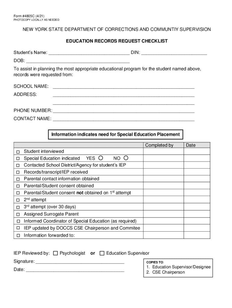 Form #4805C (4/21) PHOTOCOPY LOCALLY AS NEEDED YORK STATE DEPARTMENT OF CORRECTIONS AND COMMUNITY SUPERVISION EDUCATION RECORDS REQUEST CHECKLIST Students Name: ___ DIN: ___ DOB: ___ To assist in