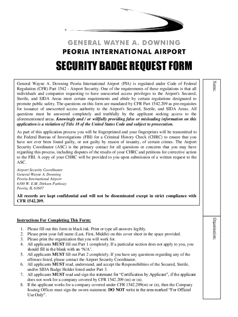 SECURITY BADGE REQUEST FORM Name:General Wayne A. Downing Peoria International Airport (PIA) is regulated under Code of Federal Regulation (CFR) Part 1542 Airport Security. One of the requirements