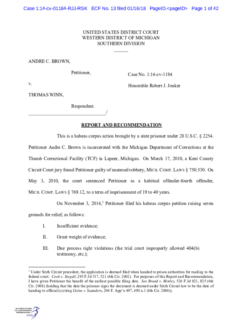 Case 1:14cv01184RJJRSK ECF No. 13 filed 01/16/18 Paged. Paged Page 1 of 42UNITED STATES DISTRICT COURT WESTERN DISTRICT OF MICHIGAN SOUTHERN DIVISION ___ ANDRE C. BROWN, Petitioner, v. Case No. 1:14cv1184
