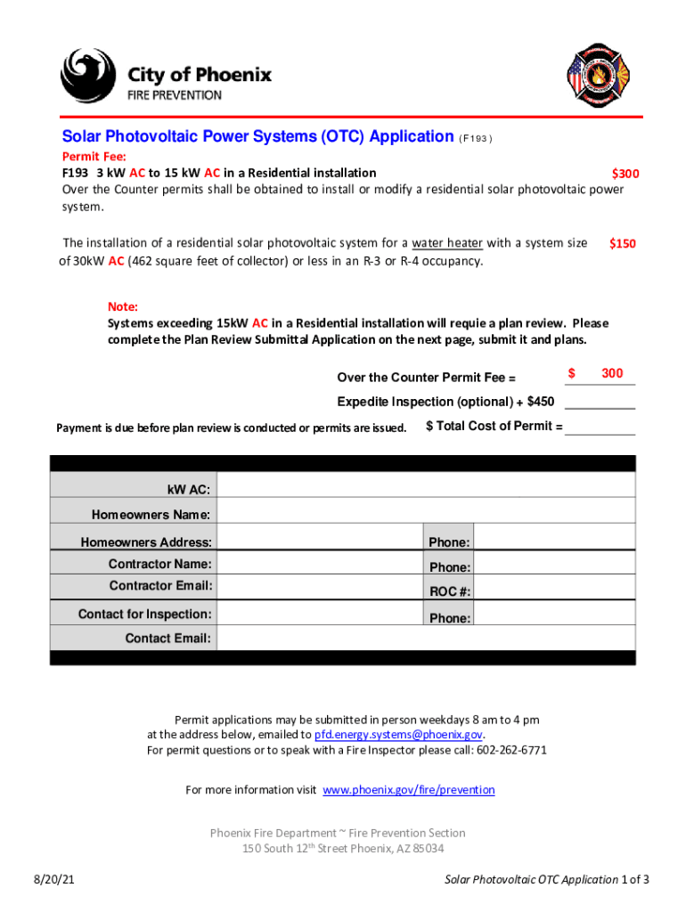 Solar Photovoltaic Power Systems (OTC) Application(F193)Permit Fee: F193 3 kW AC to 15 kW AC in a Residential installation $300 Over the Counter permits shall be obtained to install or modify a residential