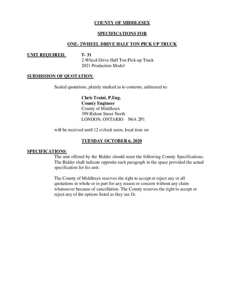 COUNTY OF MIDDLESEX SPECIFICATIONS FOR ONE 2WHEEL DRIVE HALF TON Pickup TRUCK UNIT REQUIRED’T 31 2WheelDrive Half Ton Pickup Truck 2021 Production ModelSUBMISSION OF QUOTATION: Sealed quotations,