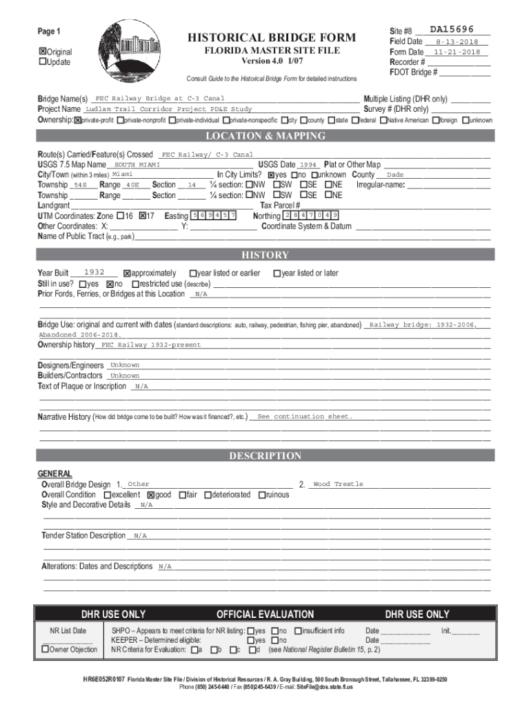 Page 1HISTORICAL BRIDGE FORM Original UpdateFLORIDA MASTER SITE FILE Version 4.0 1/07 Consult Guide to the Historical Bridge Form for detailed instructionsDA15696 Site #8 ___ 8132018 Field Date ___