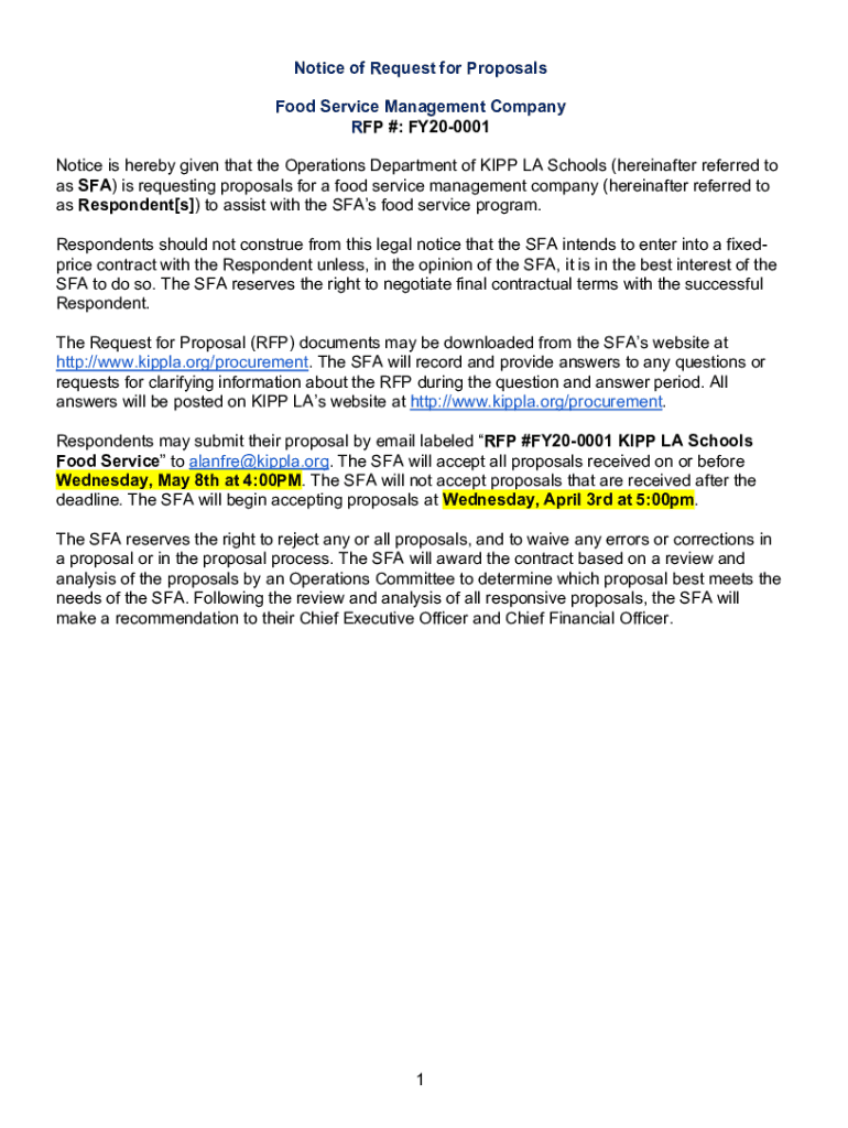 Notice of Request for Proposals Food Service Management Company RFP #: FY200001 Notice is hereby given that the Operations Department of IPP LA Schools (hereinafter referred to as SFA) is requesting