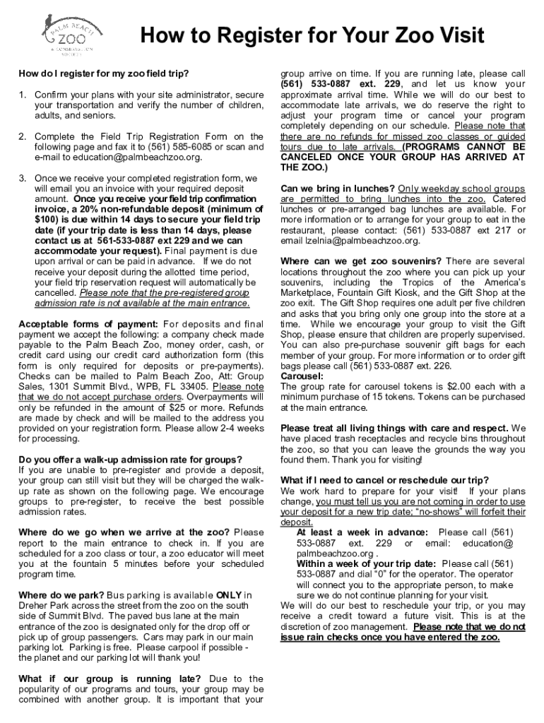 How to Register for Your Zoo Visit How do I register for my zoo field trip? 1. Confirm your plans with your site administrator, secure your transportation and verify the number of children, adults,