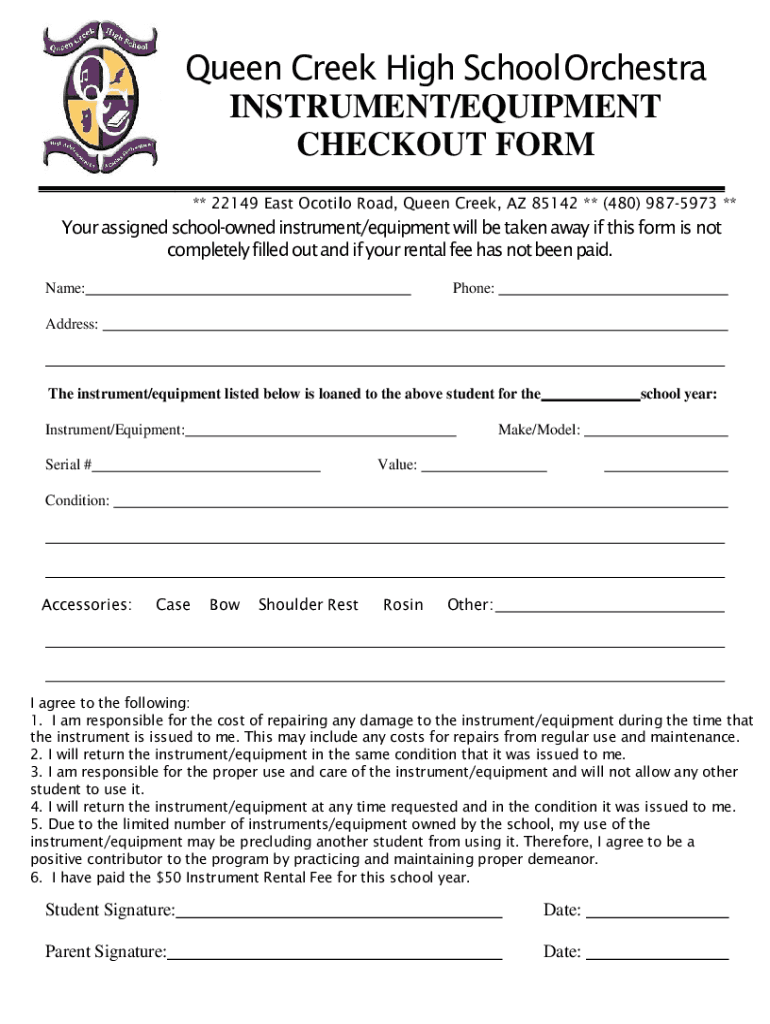 Queen Creek High SchoolOrchestra INSTRUMENT/EQUIPMENT CHECKOUT FORM ** 22149 East Scotia Road, Queen Creek, AZ 85142 ** (480) 9875973 **Your assigned school owned instrument/equipment will be taken