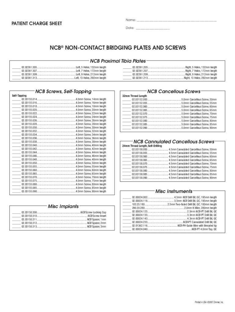 Get the free NCB Non-Contact Bridging Plates and Screws Proximal Tibia Patient Charge Sheet