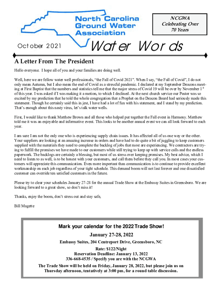 NCAA Celebrating Over 70 Years October 2021Water Words Letter From The President Hello everyone. I hope all of you and your families are doing well. Well, here we are fellow water well professionals,
