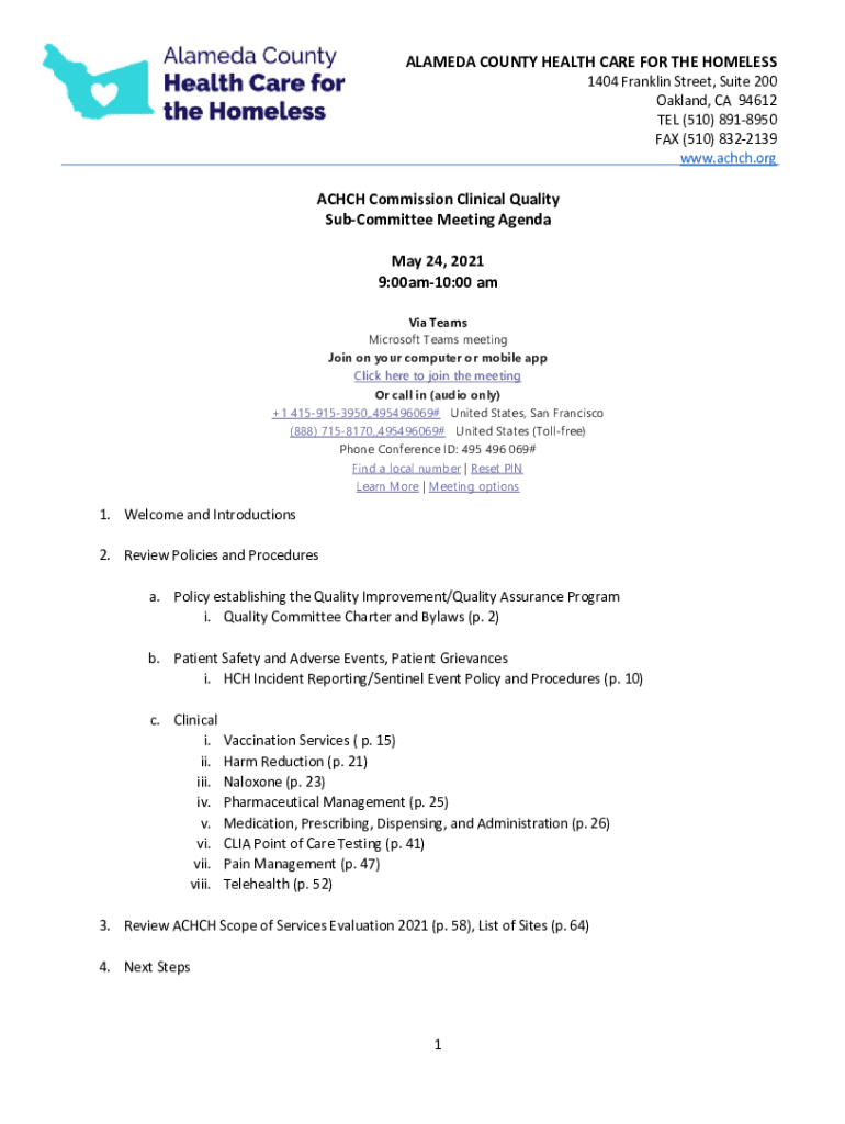 ALAMEDA COUNTY HEALTH CARE FOR THE HOMELESS1404 Franklin Street, Suite 200 Oakland, CA 94612 TEL (510) 8918950 FAX (510) 8322139 www.achch.orgACHCH Commission Clinical Quality Subcommittee Meeting