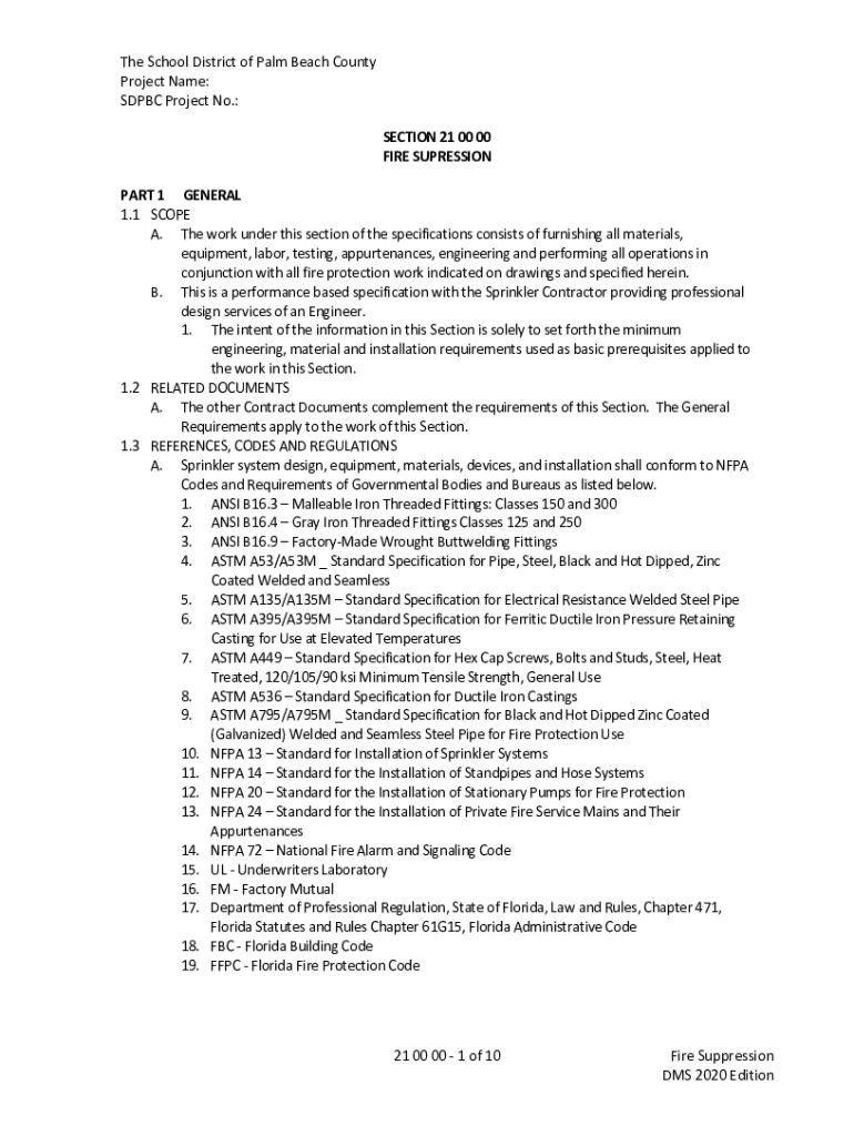 The School District of Palm Beach County Project Name: SDPC Project No.: SECTION 21 00 00 FIRE SUPPRESSION PART 1 GENERAL 1.1 SCOPE A. The work under this section of the specifications consists of