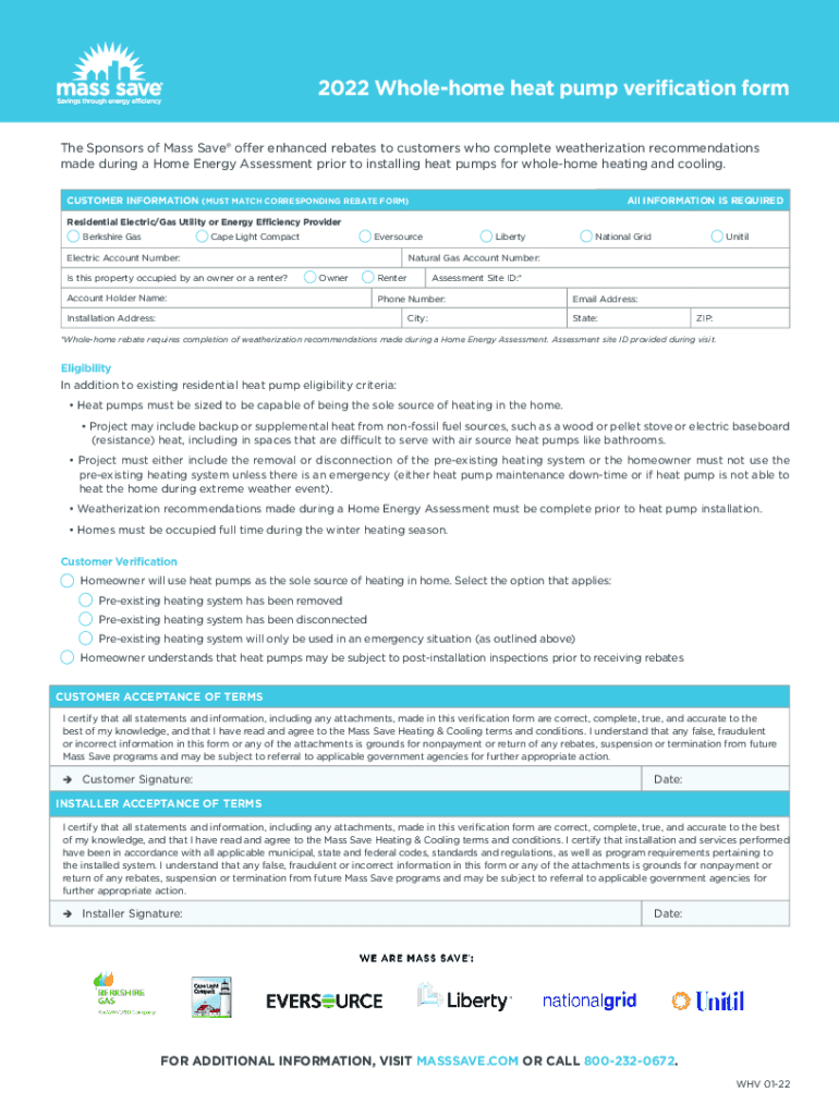 2022 Wholesome heat pump verification form The Sponsors of Mass Save offer enhanced rebates to customers who complete weatherization recommendations made during a Home Energy Assessment prior to installing