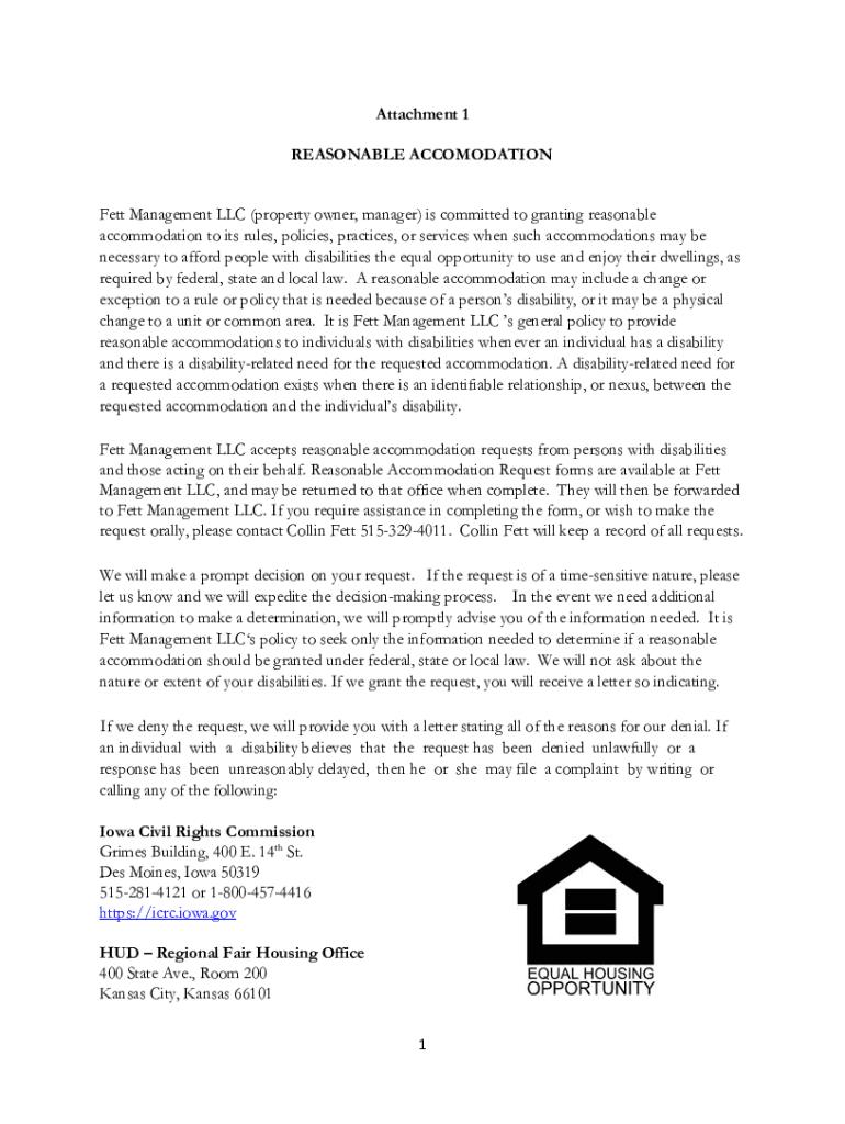 Attachment 1 REASONABLE ACCOMMODATION Feet Management LLC (property owner, manager) is committed to granting reasonable accommodation to its rules, policies, practices, or services when such accommodations