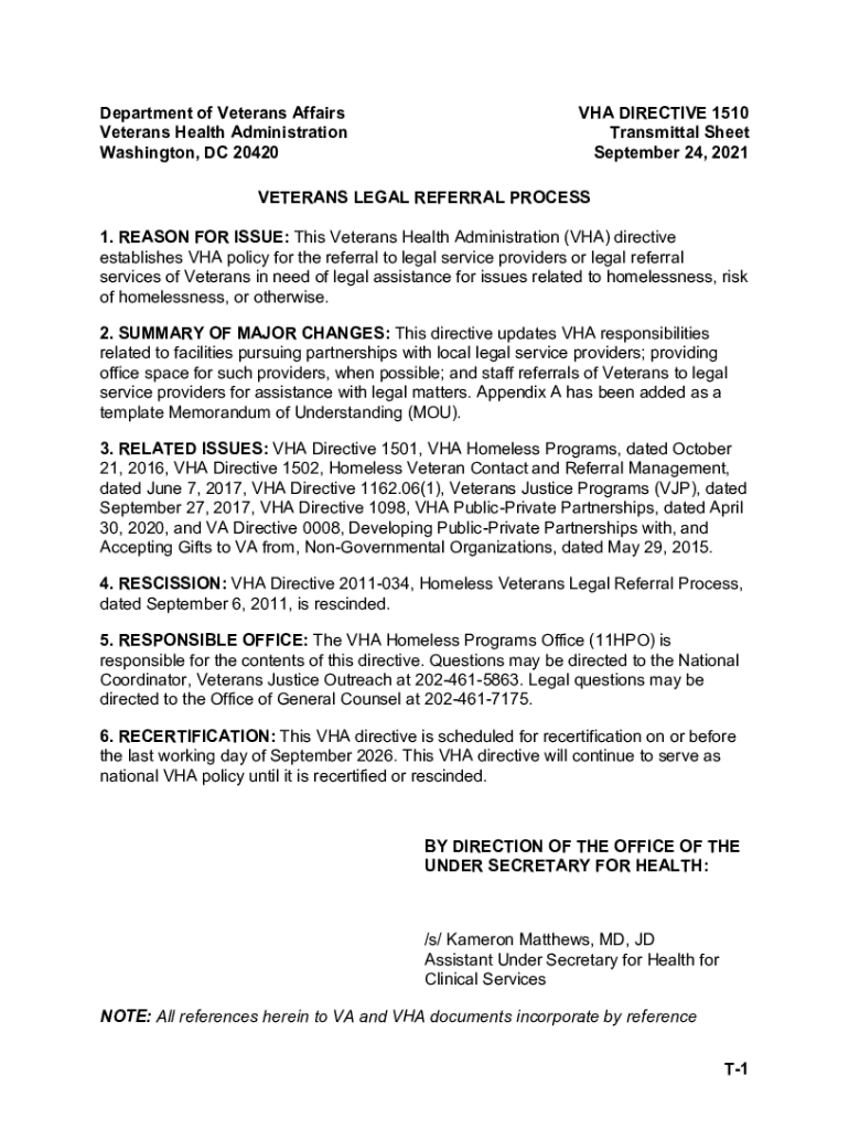Department of Veterans Affairs Veterans Health Administration Washington, DC 20420VHA DIRECTIVE 1510 Transmittal Sheet September 24, 2021VETERANS LEGAL REFERRAL PROCESS 1. REASON FOR ISSUE: This Veterans
