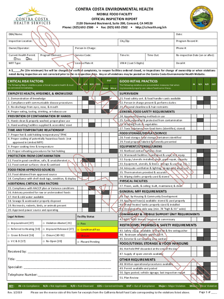 CONTRA COSTA ENVIRONMENTAL HEALTH MOBILE FOOD FACILITY OFFICIAL INSPECTION REPORT 2120 Diamond Boulevard, Suite 200, Concord, CA 94520 Phone: (925) 6922500 Fax: (925) 6922502 http://cchealth.org/eh