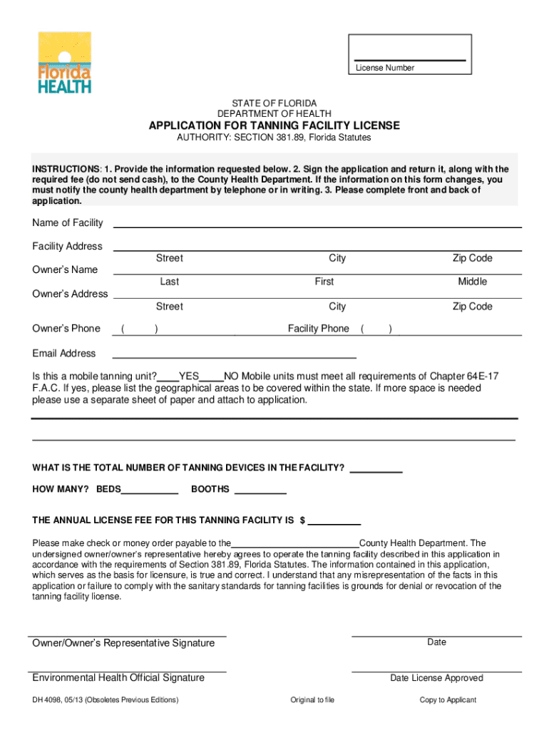 License Understate OF FLORIDA DEPARTMENT OF HEALTHAPPLICATION FOR TANNING FACILITY LICENSE AUTHORITY: SECTION 381.89, Florida StatutesINSTRUCTIONS: 1. Provide the information requested below. 2. Sign