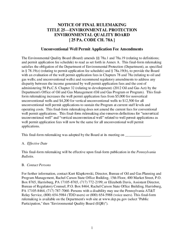 NOTICE OF FINAL REMAKING TITLE 25ENVIRONMENTAL PROTECTION ENVIRONMENTAL QUALITY BOARD [25 PA.CODE CH. 78A] Unconventional Well Permit Application Fee Amendments The Environmental Quality Board (Board)
