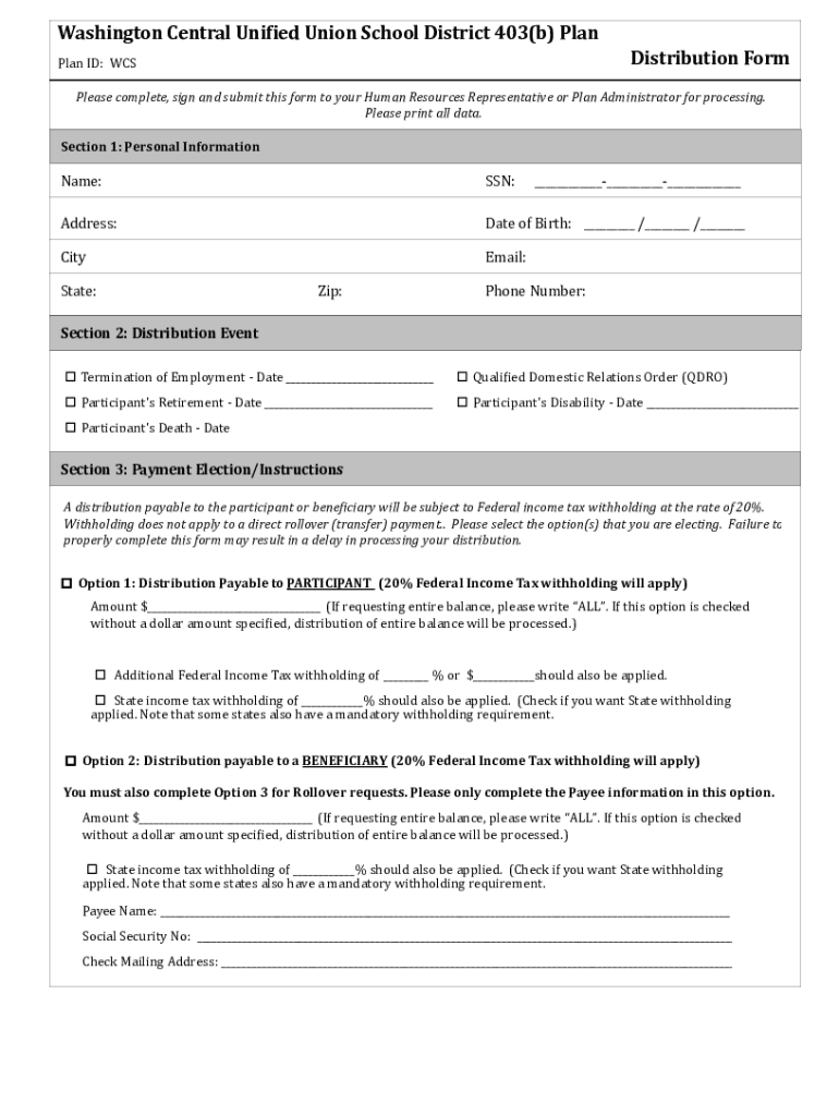 Washington Central Unified Union School District 403(b) Plan Distribution Formula ID: Displease complete, sign and submit this form to your Human Resources Representative or Plan Administrator for