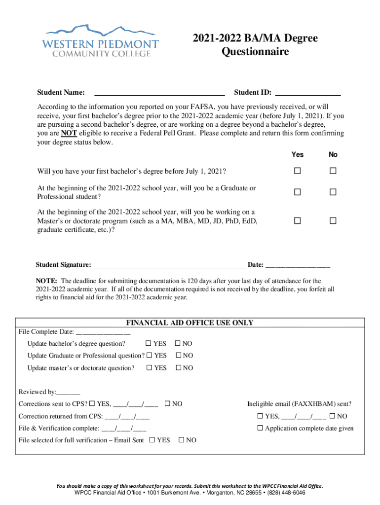 20212022 BA/MA Degree QuestionnaireStudent Name:___Student ID: ___According to the information you reported on your FAFSA, you have previously received, or will receive, your first bachelors degree