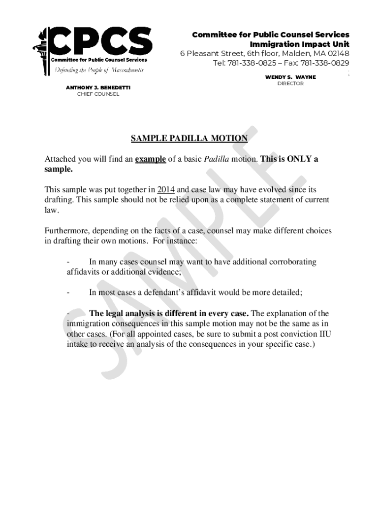 Committee for Public Counsel Services Immigration Impact Unit 6 Pleasant Street, 6th floor, Malden, MA 02148 Tel: 7813380825 Fax: 7813380829 ICU×public counsel.net WENDY S. WAYNE DIRECTORANTHONY