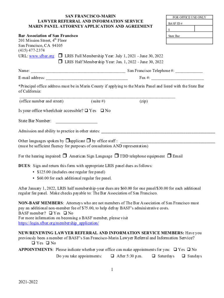 SAN FRANCISCOMARIN LAWYER REFERRAL AND INFORMATION SERVICE MARIN PANEL ATTORNEY APPLICATION AND AGREEMENT Bar Association of San Francisco 201 Mission Street, 4th Floor San Francisco, CA 94105 (415)