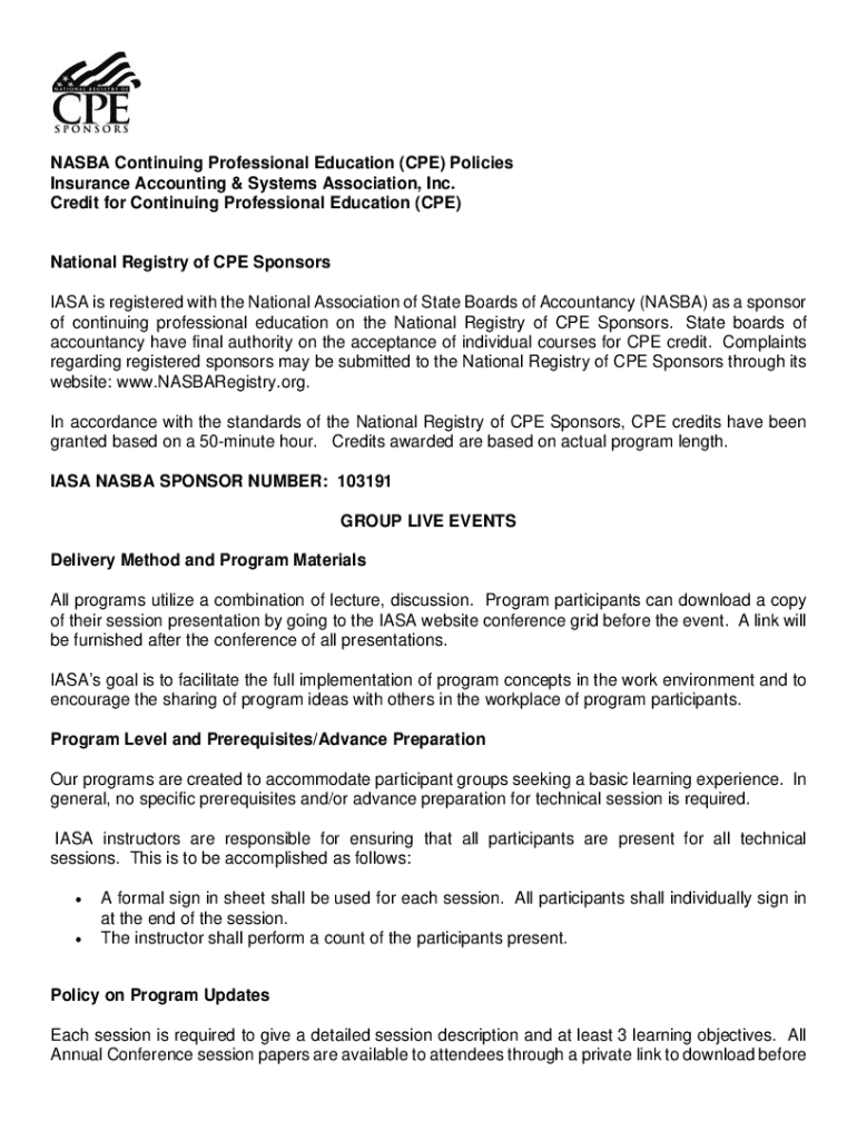 NASA Continuing Professional Education (CPE) Policies Insurance Accounting & Systems Association, Inc. Credit for Continuing Professional Education (CPE)National Registry of CPE Sponsors NASA is registered