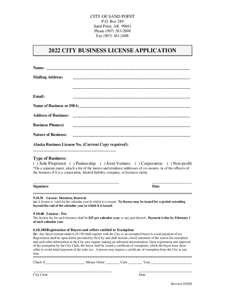 CITY OF SAND POINT P.O. Box 249 Sand Point, AK 99661 Phone (907) 3832696 Fax (907) 38326982022 CITY BUSINESS LICENSE APPLICATION Name: ___ Mailing Address:___ ___Email:___Name of Business or DBA:___