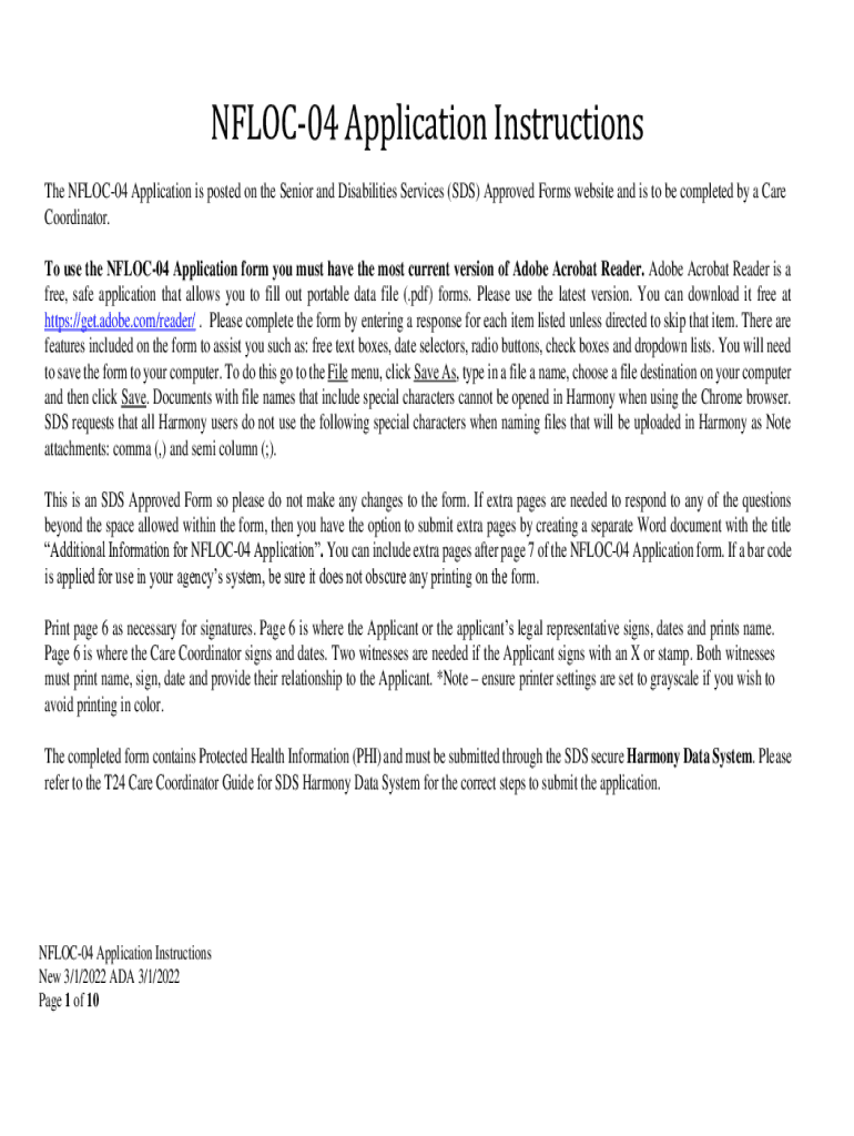 NFLOC04 Application Instructions The NFLOC04 Application is posted on the Senior and Disabilities Services (SDS) Approved Forms website and is to be completed by a Care Coordinator. To use the NFLOC04