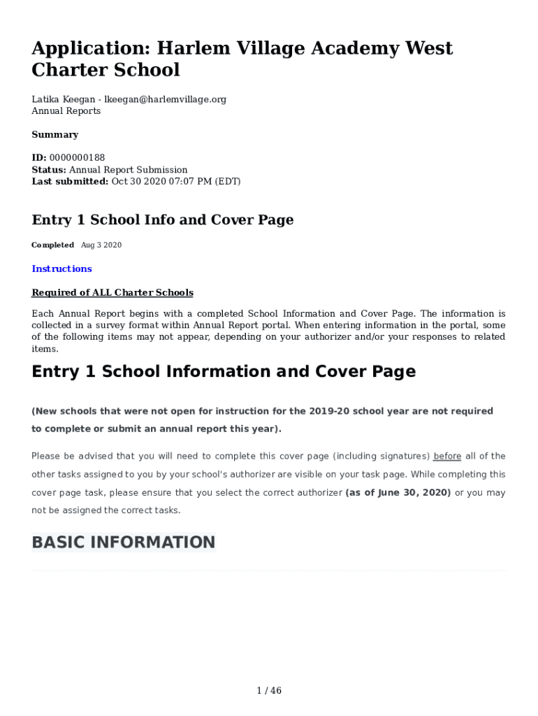 Application: Harlem Village Academy West Charter School Latina Keegan×harlemvillage.org Annual Reports Summary ID: 0000000188 Status: Annual Report Submission Last submitted: Oct 30 2020 07:07 PM