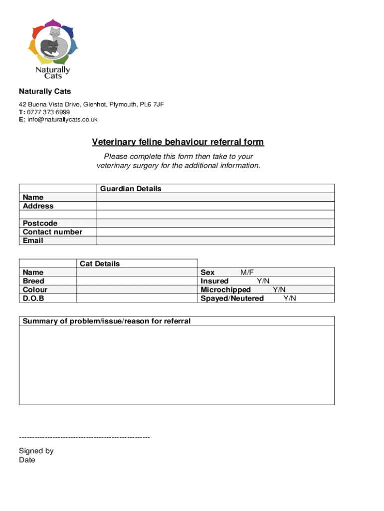 Naturally Cats 42 Buena Vista Drive, Glen hot, Plymouth, PL6 7JF T: 0777 373 6999 E: info×naturally cats.co.veterinary feline behavior referral form Please complete this form then take to your veterinary