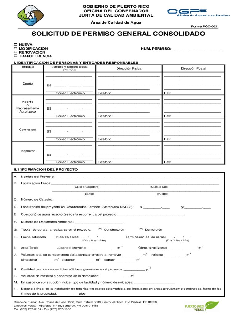 GOVERNOR DE PUERTO RICO OFFICIAL DEL GOVERNOR JUNTA DE CALIBAN AMBIENT AL REA de Cali dad de Agra Form PGC002SOLICITUD DE PERM ISO GENERAL CONSOLIDATE 1 NEVA 1 MODIFICATION 1 RENOVATION 1 TRANSFERENCIANUM.