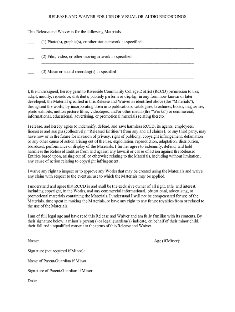 RELEASE AND WAIVER FOR USE OF VISUAL OR AUDIO RECORDINGS This Release and Waiver is for the following Materials: ___(1) Photo(s), graphic(s), or other static artwork as specified: ______(2) Film,