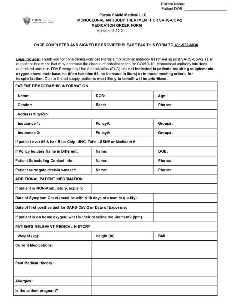 Patient Name:___ Patient DOB: ___ Purple Shield Medical LLC MONOCLONAL ANTIBODY TREATMENT FOR SARSCOV2 MEDICATION ORDER FORM Version 12.22.21ONCE COMPLETED AND SIGNED BY PROVIDER PLEASE FAX THIS FORM