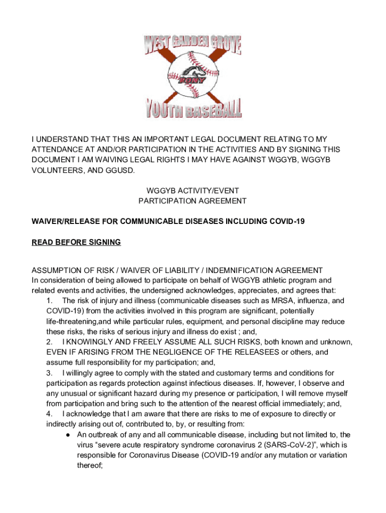 I UNDERSTAND THAT THIS AN IMPORTANT LEGAL DOCUMENT RELATING TO MY ATTENDANCE AT AND/OR PARTICIPATION IN THE ACTIVITIES AND BY SIGNING THIS DOCUMENT I AM WAIVING LEGAL RIGHTS I MAY HAVE AGAINST GGY,