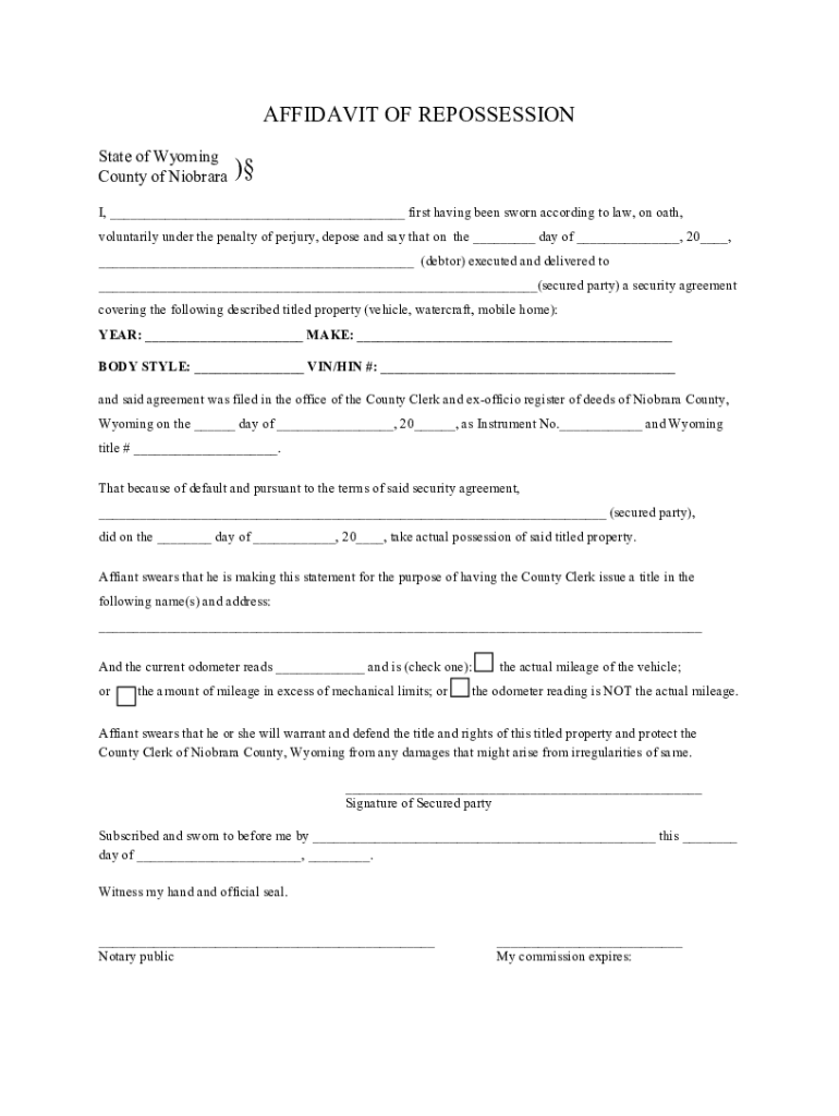 AFFIDAVIT OF REPOSSESSION State of Wyoming County of Library)I, ___ first having been sworn according to law, on oath, voluntarily under the penalty of perjury, depose and say that on the ___ day