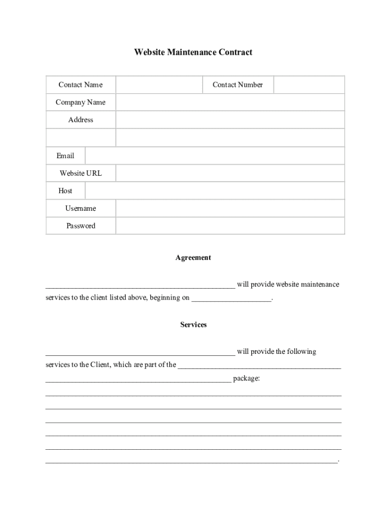 Website Maintenance Contract Contact Recontact NumberCompany Name AddressEmail Website URL Host Username PasswordAgreement ___ will provide website maintenance services to the client listed above,
